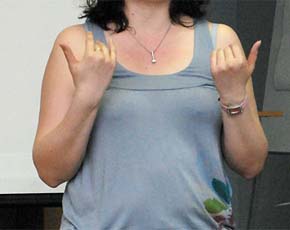 Ведущий курсов в Вычегодской школе, специалист-сурдопереводчик Архангельского регионального отделения Всероссийского общества глухих Лариса Ляпкасова, на своих занятиях определит роль жестового языка, как средства общения в социуме неслышащих, средства мышления и хранения информации неслышащими учащимися.