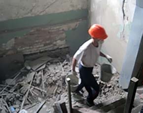 Тем временем в здании идут уборочные работы. Четверо строителей в марлевых повязках расчищают завал и выносят мусор из подъезда.