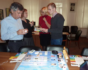 На снимке (слева направо): председатель МГО ВОГ В. З. Базоев, секретарь-переводчик И. А. Егорова, заместитель председателя МГО ВОГ Г. Н. Гаврилова и специалист по реабилитационной технике компании «Исток Аудио» Д. А. Кондрашов.