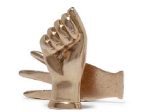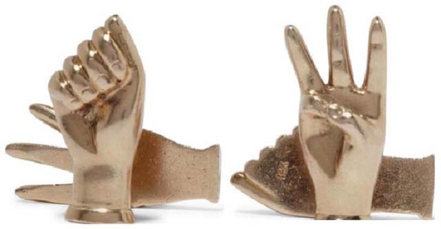 Особенность данных запонок состоит в том, что они посвящены языку немых и глухих – языку жестов. Запонки сделаны в виде рук, которые показывают жесты обозначающие различные буквы английского алфавита. На рисунке выше пара запонок из 14К желтого золота показывающие английские буквы A и W. По размерам запонки составляют 2,5 см в длину и 1 см в ширину. Стоимость одной пары $14 500.