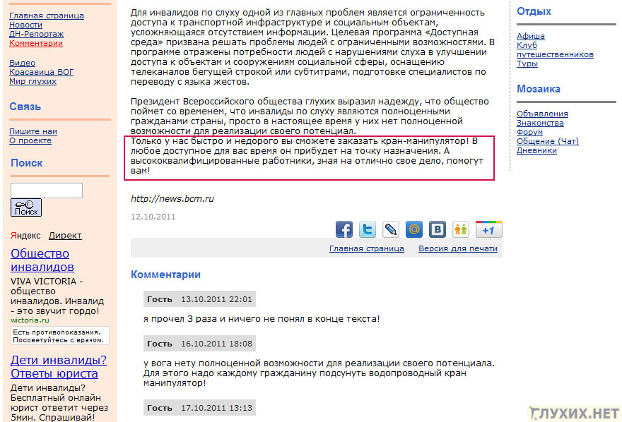 Несмотря на то, что новость была опубликована ещё неделю назад, пользователи заметили эту ошибку в основном только сейчас, и пересылают друг другу ссылку на этот материал. Хорошо, что сайт поднял настроение своим посетителям, но глухие не без опасения пишут, что «