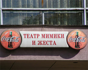 «Адвокатское бюро», «Магазин мебели», «Магазин кожаной мебели», «Мебель для кухни», «Срочный ремонт одежды и сумок», «Зоомагазин: Птички, рыбки, грызуны!», «Школа балета Todes». Вывеска с названием театра с обеих сторон стиснута рекламой