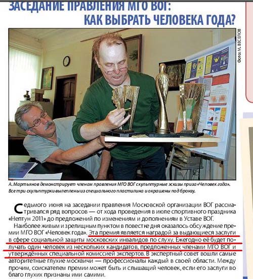 Базоев может быть человеком, который многое сделал для глухих. Но быть «Человеком года» в этой ситуации – крайне неприлично и непорядочно. Ну, нельзя же из чисто моральных и нравственных соображений вручать председателю МГО ВОГ награду, учреждённую возглавляемой им же МГО ВОГ!