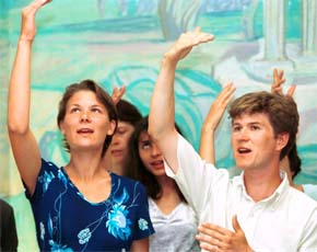 После разминки урок идет по схеме «проверка домашнего задания — новая тема — диалог — домашнее задание». Кроме типовых уроков бывают тренинги, игры, работа с дисками и компьютерными программами. Больше всего ученики любят жестовое пение. «Во время пения жесты очень хорошо укладываются в голове. Это логично: например, в Индии детей учили азбуке через пение», — рассказывает Людмила Осокина. Курсы проходят в Театре мимики и жеста, а он представляет собой комплекс для глухих: здесь находится и спортивная организация, которая готовит сурдоолимпийцев. Учащиеся курсов плотно общаются с соседями, ходят на концерты, выступают с песнями на жестовом языке сами.