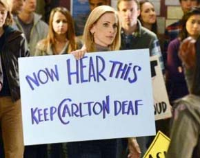 Марли исполняет там роль школьного психолога, который находится в центре событий – протеста, организованного студентами против закрытия школы глухих. Эта сцена навеяна историческими событиями, в 1988 году происходившими в университете Галлодет.