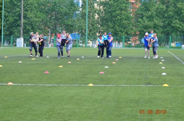 Теперь уже папы соревновались в игре «Бег кенгуру» в точности копируя манеру австралийских животных прыжками в мешках. Затем была эстафета «Не теряй ребенка», где задачей для взрослых участников – на сцепленных руках аккуратно и быстро перенести свое чадо на определенное расстояние и вернуть его на место, не уронив его и самим не упав. Вы думаете это простое задание?! Нет! Это очень трудное испытание на координацию, силу, быстроту! Но наших участников трудности не пугали, все справились. Жюри между тем подводили итоги – у «Радуги» было 13 очка, у «Семьи Аверкиных»- 10 очков, а у остальных по 8 очков.
