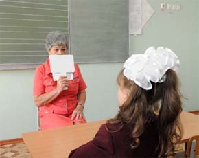 Валерия Артамонова в первые дни учебного года проводит диагностику слуха у своих уникальных первоклашек. Диагностику необходимо проводить ежедневно у каждого ребенка в течение недели с частотой раз в полгода.