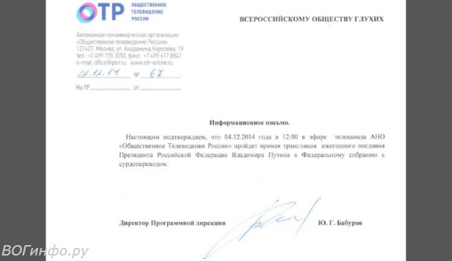 телеканала ОТР (не путать с ОРТ) прямая трансляция будет сопровождаться переводом на жестовый язык, как сообщили ВОГинфо.ру представители программной дирекции канала.