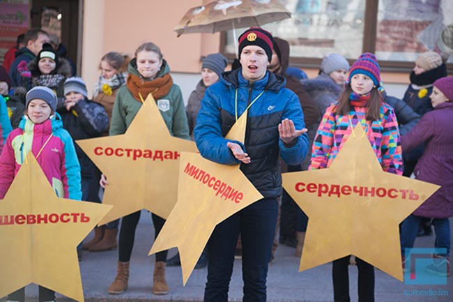Как рассказала директор школы-интерната для детей с нарушением слуха Татьяна Солтан, идею для флешмоба придумали ученики старших классов. Они заимствовали ее из шедевров Леонардо да Винчи, Микеланджело, Родена, Рембрандта, Рафаэля, Гойи и других выдающихся деятелей искусства. Живые скульптуры воплощали собой чувства, которые помогают человеку не стать наркоманом: «любовь», «гуманность», «милосердие». Некоторые участники стали «живыми звездами» и на языке жестов исполнили песню, посвященную борьбе со спайсом.