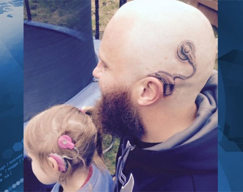 Алистар Кэмпбелл сделал на своей голове татуировку в виде кохлеарного импланта — протеза, позволяющую компенсировать потерю слуха. Столь своеобразным образом он решил поддержал свою шестилетнюю дочь Шарлотту, которая вынуждена носить два таких устройства.