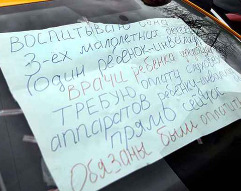 Ольга отправила письмо в Департамент соцзащиты с просьбой предоставить средства на покупку новых слуховых аппаратов на каждое ухо — полное название Phonak naida Q 90 CRT. Вместе с выносным ресивером они стоят 337 000 рублей. В ответ ей предложили оплатить самую дешевую модель, которая стоит в 10 раз дешевле. Точь-в-точь как брянские чиновники пять лет назад. Но дело в том, что с ними Полина не сможет нормально слышать: они очень плохо передают звуки, в них не слышно окончаний слов. Все эти доводы Ольга изложила в письме. И когда получила отрицательный ответ, в отчаянии села с детьми в машину из автопарка и снова поехала добиваться встречи — теперь уже с Путиным. Съехала с Большого Каменного моста, припарковалась у Боровицкой башни Кремля, наклеила на окна плакаты. Полиция уговорила мамочку не поднимать шум и отправила домой.
