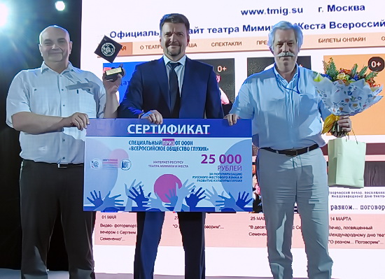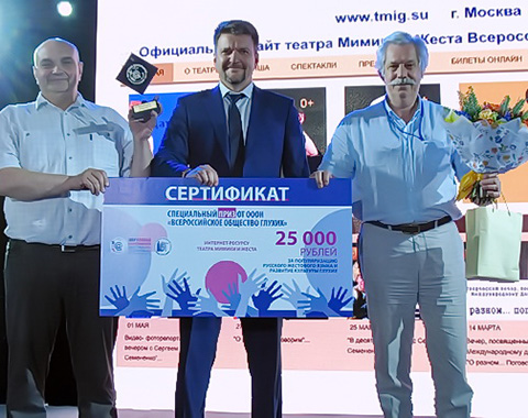 Специальный приз фестиваля от Всероссийского общества глухих вручал вице-президент ВОГ Станислав Александрович Иванов. Памятный кубок и сертификат на 25000 рублей выиграл официальный сайт театра Мимики и Жеста.