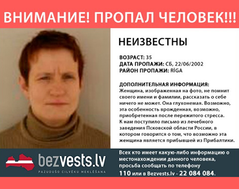 В Латвии пропавших людей в возрасте старше 70 лет ищут всего 5 лет, а тех, кто младше – 10 лет. После этого поиски прекращаются, но близкие продолжают надеяться на лучшее и верить, что человек жив, однако найти его не могут. Наверняка, и эту женщину кто-то ищет. В базе данных Bezvests.lv она уже 4 года, а в розыске – 14 лет – c 2002 года! Похоже, женщина пережила какую-то личную трагедию, что и повлияло на ее здоровье. Возможно, ваши перепосты помогут найти ее родных!