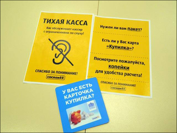 Касса, где работают слабослышащие кассиры, обозначена специальной табличкой «Тихая касса». Чтобы оперативно решать возможные вопросы, слабослышащий кассир работает рядом со слышащим коллегой. Однако, отметила Полянская, кассиры на «тихих кассах» стараются решать все вопросы самостоятельно.