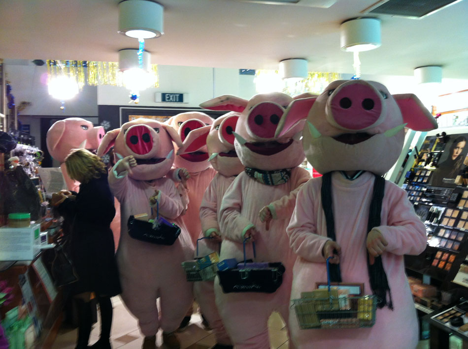 Каждую акцию активисты проводят, надев на себя костюмы больших свиней со злыми пятаками (мордами). Отсюда и берет начало название движения. Смысл этих костюмов прост: «