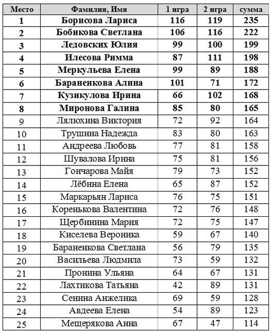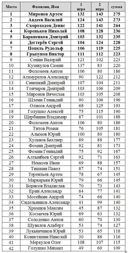 По окончании соревнования жюри объявило список игроков, занявших 1−8 места. Шестнадцать человек (8 мужчин и 8 женщин) продолжат борьбу между собой за 1−3 призовые места, но в другой день, 16 февраля, в день проведения Первого чемпионата Рязанской области по боулингу.