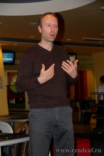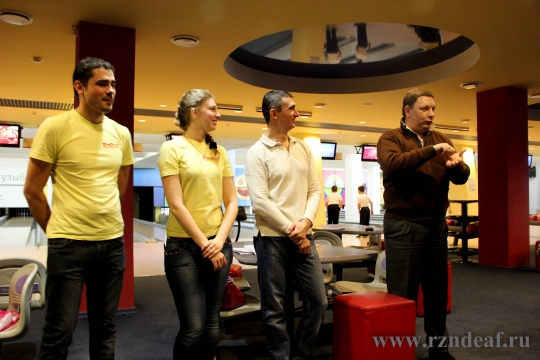 На этом спортивное мероприятие не закончилось. Лидер молодежной организации Алексей Голушко представил публике Владислава Антипова, президента Всероссийской федерации боулинга глухих. Гость поведал слушателям историю развития боулинга среди глухих, рассказал про победы и поражения глухих игроков по боулингу на соревнованиях высокого уровня, дал некоторые полезные советы о том, как лучше всего тренироваться, о технике игры. Мероприятие прошло на ура, публика расходилась довольная! До новых встреч!2 февраля 2013 года в боулинг-клубе «ОЗОН» состоялся отборочный тур Первого чемпионата Рязанской области по боулингу.