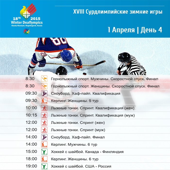 Сегодня, 1 апреля, в Ханты-Мансийске и Магнитогорске пройдет четвертый день XVIII Сурдлимпийских зимних игр. Будут разыграны шесть комплектов медалей.