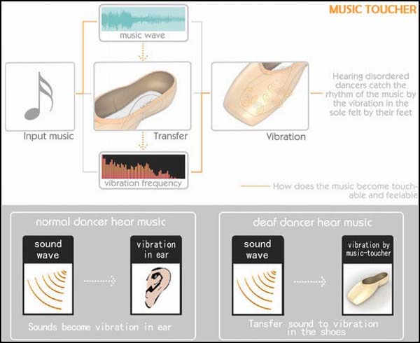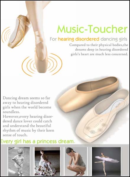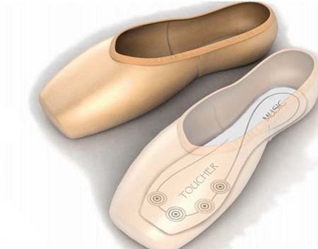 Music-Toucher помогут почувствовать ритм с помощью вибрации. На подошве балетных туфель расположены звукочувствительные сенсоры, передатчик и элемент, создающий вибрацию.