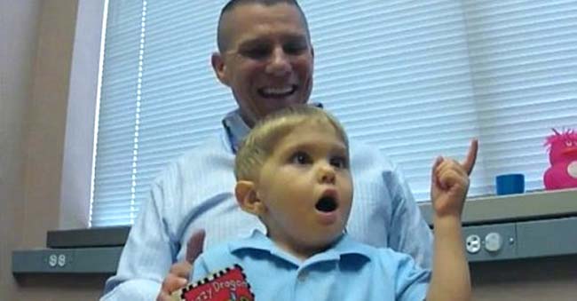 Этот трехлетний малыш из США услышал первые в своей жизни звуки, и на его лице появилось забавное выражение сильнейшего удивления. Ребенку установили уникальный стволовой слуховой имплант мозга.