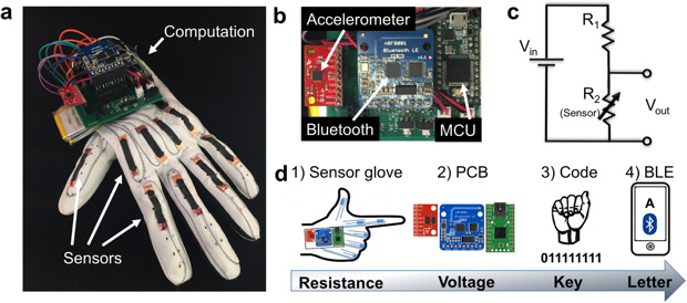 Оно представляет собой специальную «умную» перчатку. На каждый палец перчатки, кроме большого, прикреплено по два пьезорезистивных датчика, которые меняют сопротивление при растяжении. Они присоединены к вычислительному модулю, в котором также находятся акселерометр и Bluetooth-передатчик.