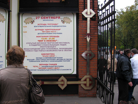 У входа в парк красовалась вывеска: «Открытый творческий фестиваль в поддержку слабослышащих людей, приуроченный к международному дню глухонемых». Вот тебе и интеграция инвалидов-«глухонемых» в общество. Но на самом концерте председатель МГО ВОГ В. З. Базоев попытался исправить ситуацию, объяснив, как следует называть этих самых «глухонемых» людей.