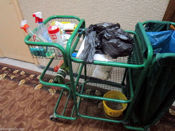 А у Марины противоположное мнение: «Наладить отношение с горничной не удалось. Я возмущалась, что у меня под кроватью был толстый слой пыли! В ванную комнату даже неприятно заходить, попросила помыть, а мне обиженно отвечают: «А я уже мыы-ыла!» Посмотрите, что у горничной на тележке: флаконы и банки из-под моющих средств у них пустые! Чем они тогда моют номера, непонятно!», – и в знак доказательства Марина даже выложила в свой Интернет-дневник фотографии, на которых отчётливо видны почти пустые упаковки моющих средств.