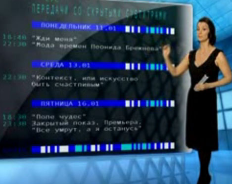По телевизору с телетекстом. Телевизор должен иметь плоский экран, диагональ не менее 81 см, пульт дистанционного управления, функцию изменения размера телетекста и разъемы для подключения наушников, видеомагнитофона, плейера и другого оборудования для просмотра субтитрованнных видеоматериалов и срок эксплуатации не менее 7 лет.