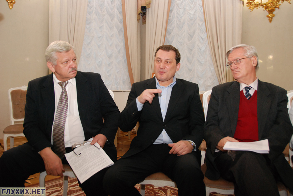 Президент ВОГ, ОФСГ и СКР Валерий Рухледев и глава московской федерации физкультуры и спорта глухих Владимир Фельде слушают перевод Вадима Иванченко