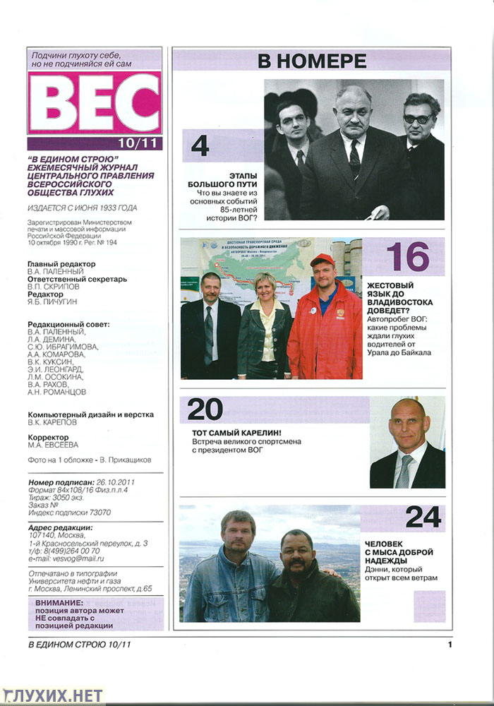 Сомнительно, чтобы проблемные темы поднимались в журнале. Вот если бы написали вдумчивую статью, с разбирательство м на тему "Ужастик в Москве: ИПР оформил призрак? ", которая тут остро обсуждается: http://www.gluxix.net/deafnews/sobitiya/3312-2011-07-14-06-47-16#comments доверие народа бы поднялось хоть не намного. Да вот редакция, или кто там, вышестоящие над редакторами, боятся хоть чем нибудь затронуть ВОГовское руководство. По всей стране, проблем накопилось выше крыши, а в журнале об это не прочтешь, как будто все прилизано и приглажено. Ясень пень, никакие цветные выпуски рейтингу тем более доверия журнала не прибавят. Он ведь не острый, пресный какой то, прочитать и забыть!