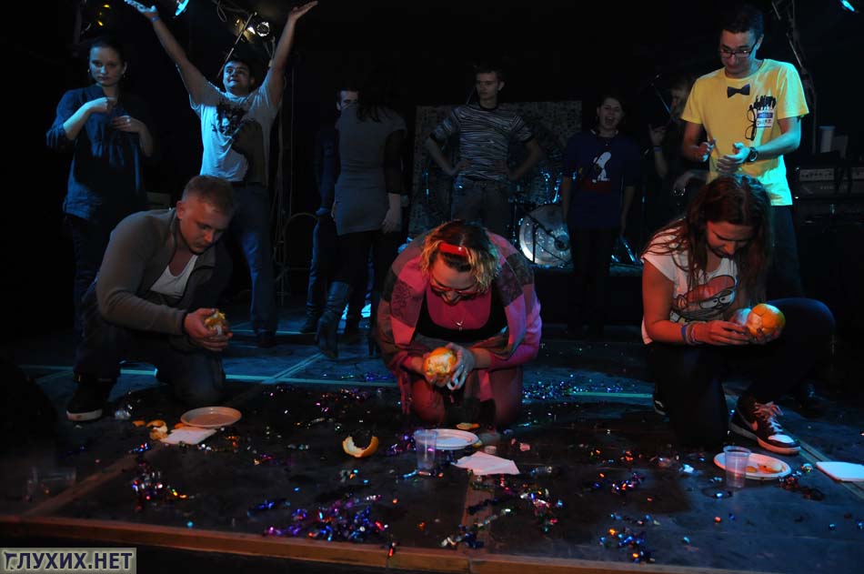 После выступления началась обширная конкурсная программа. Конкурсы были разные: сначала три команды пытались выдавить максимальное количество сока из одного апельсина.