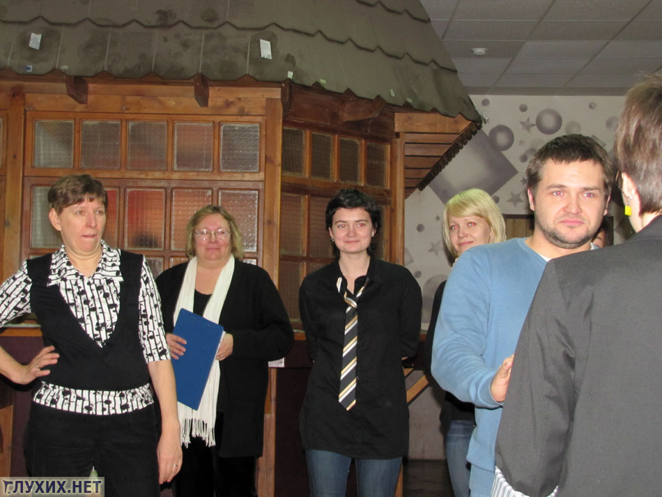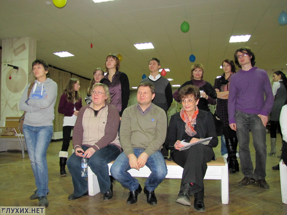 встреча участников и гостей группы Центра образования глухих и жестового языка. В фойе театра слышащие и неслышащие участники с удовольствием общались между собой. Правда, голосом разговаривать запрещалось – за это брали штраф в размере 10 рублей.