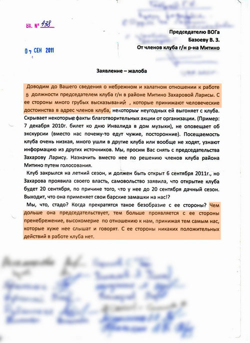 Доводим до Вашего сведения о небрежном и халатном отношении к работе в должности председателя клуба г/н в районе Митино Захаровой Ларисы. С ее стороны много грубых высказываний, которые принижают человеческие достоинства в адрес членов клуба, некоторых неугодных ей выгоняет с клуба», – говорится