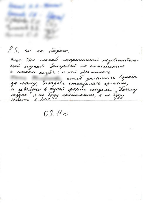 чем дольше она [Захарова] председательствует, тем больше проявляется с ее стороны пренебрежение, высокомерие по отношению к нам, принижая тем самым нас, которые хуже нее слышат и говорят. С ее стороны никаких положительных действий в работе клуба нет».