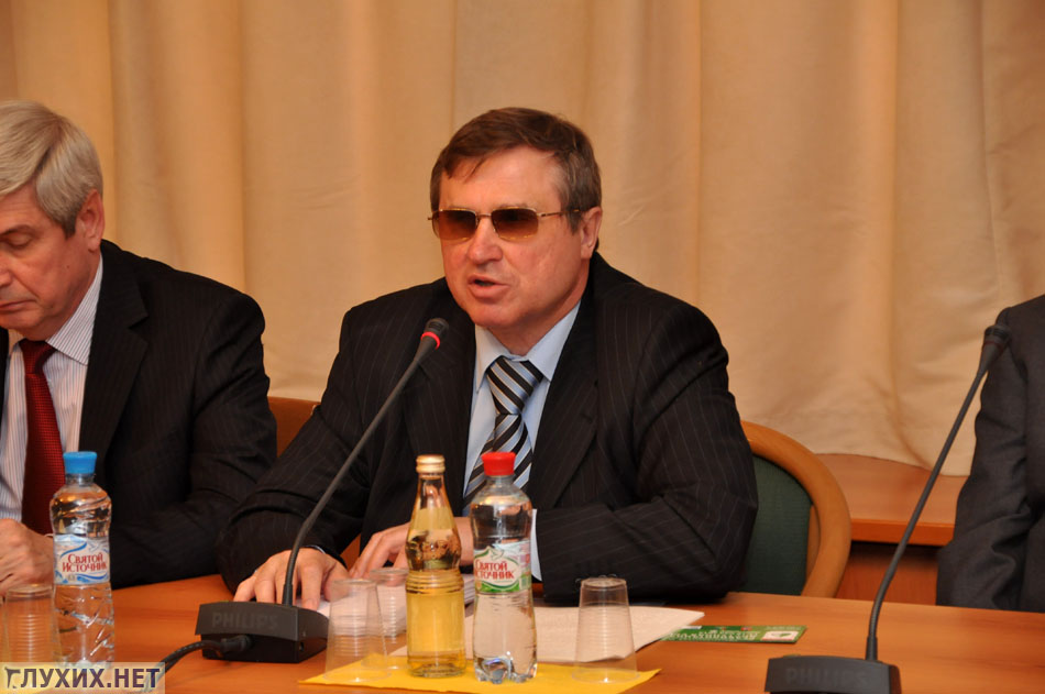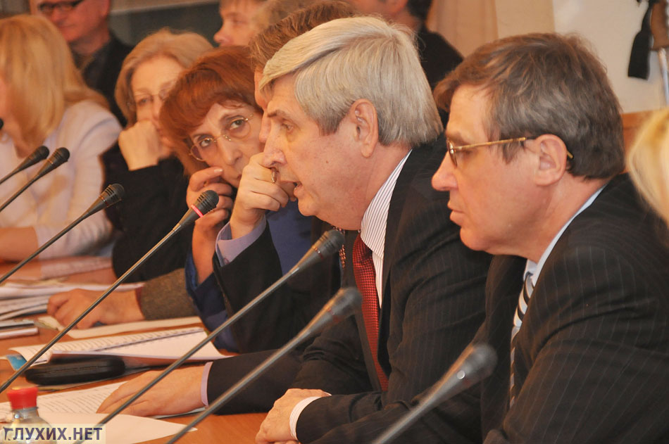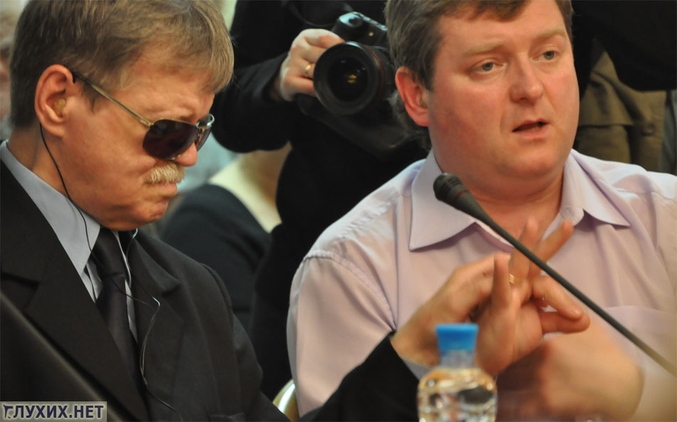 Руководитель общества слепоглухих, который сам не видит и не слышит, выступил с рассказом о том, как они смогли в свое время получить высшее образование в МГУ им. М. В. Ломоносова; о более трудном положении в социуме данной категории лиц в настоящее время.