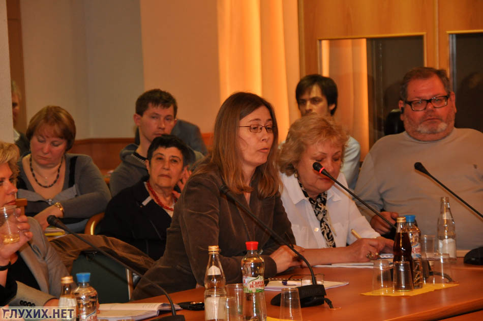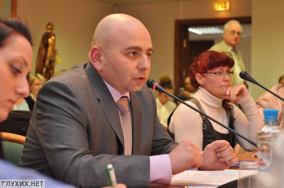 От Всероссийского общества глухих выступил Максим Ларионов, руководитель отдела социальных программ и проектов, который поделился опытом за рубежом – о «презумпции виновности» организации в отношении инвалида. Например, инвалиду было отказано в чём-то, явно по дискриминирующим признакам. Он с доказательством подаёт в суд на организацию, а суды, как правило, встают на сторону инвалида, штрафуют организацию нещадно и весьма на ощутимую сумму. М. Ларионов возмутился наличием абсурдных правил у нас в России (инвалиду с протезом запрещен вход на Останкинскую телебашню; воздушный кодекс запрещает инвалиду, в том числе неслышащим, самостоятельно летать на самолете без сопровождения).