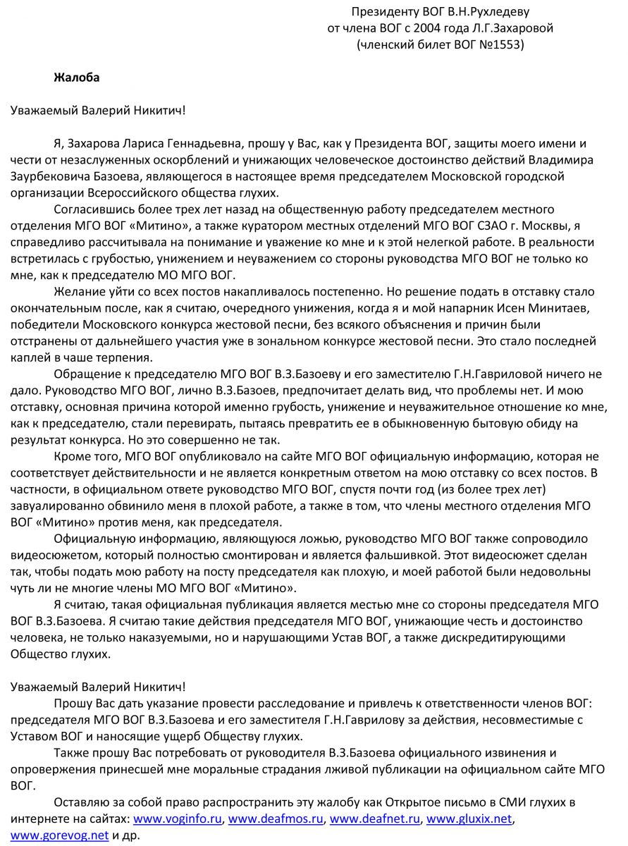 Я, Захарова Лариса Геннадьевна, прошу у Вас, как у Президента ВОГ, защиты моего имени и чести от незаслуженных оскорблений и унижающих человеческое достоинство действий Владимира Заурбековича Базоева, являющегося в настоящее время председателем Московской городской организации Всероссийского общества глухих.