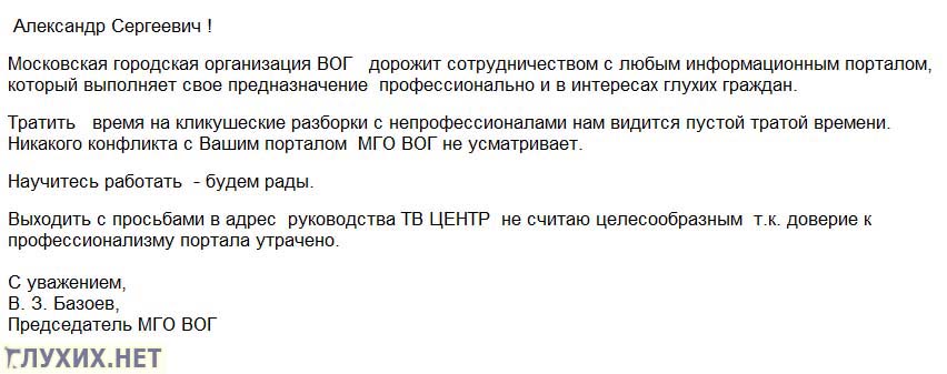 «Тратить время на кликушеские разборки с непрофессионалами нам видится пустой тратой времени. Никакого конфликта с Вашим порталом МГО ВОГ не усматривает. Выходить с просьбами в адрес руководства ТВ ЦЕНТР не считаю целесообразным т. к. доверие к профессионализму портала утрачено», – заявил в письме