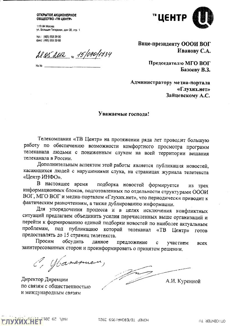 Глухих.нет» с предложением размещать объединённые новости на страницах телетекста ТВЦ. Журналисты «