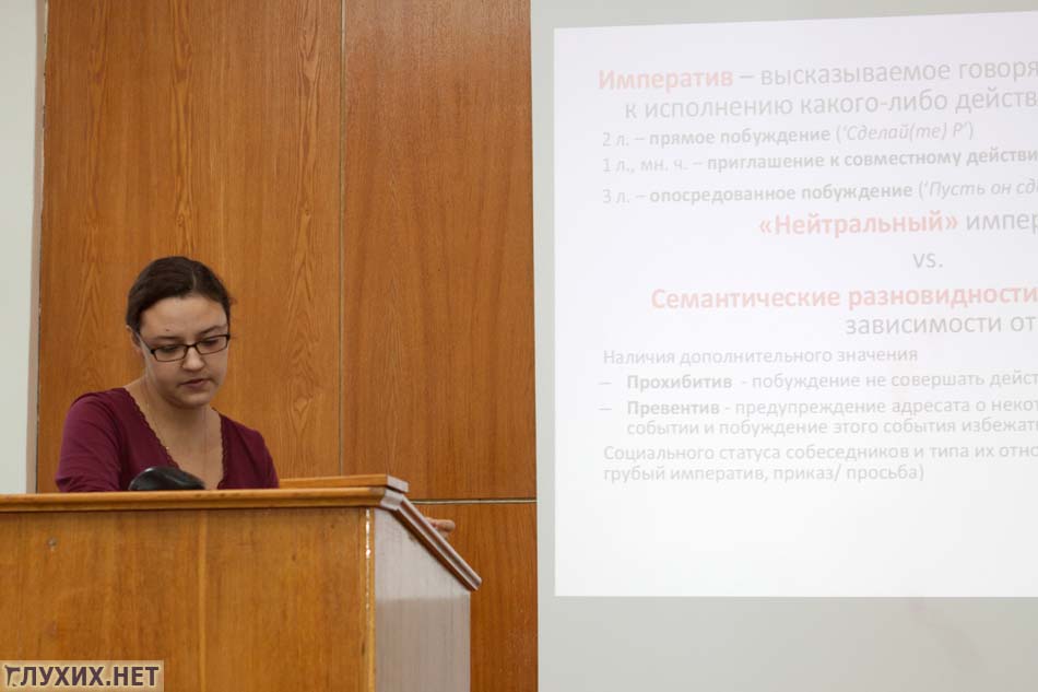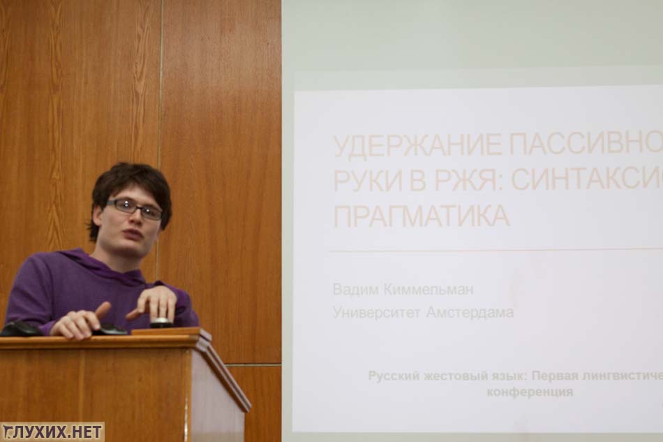 Необычное исследование провел Вадим Киммельман. Он заинтересовался ролью пассивной руки в русском жестовом языке и привел некоторые примеры своих исследований – этим раскрыл глаза многим, ничего не подозревавшим, глухим участникам конференции. Вадим сам родом из Омска, но учится в Голландском университете и там исследует языки, в том числе и голландский жестовый язык.