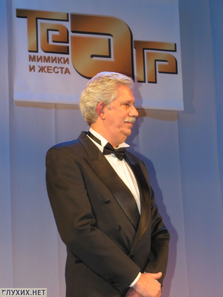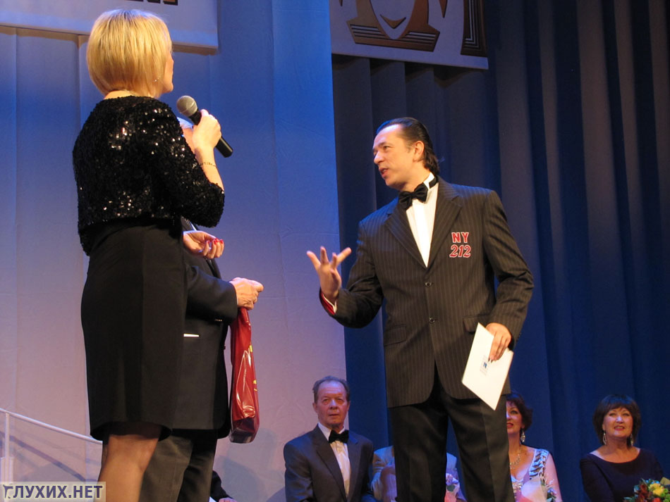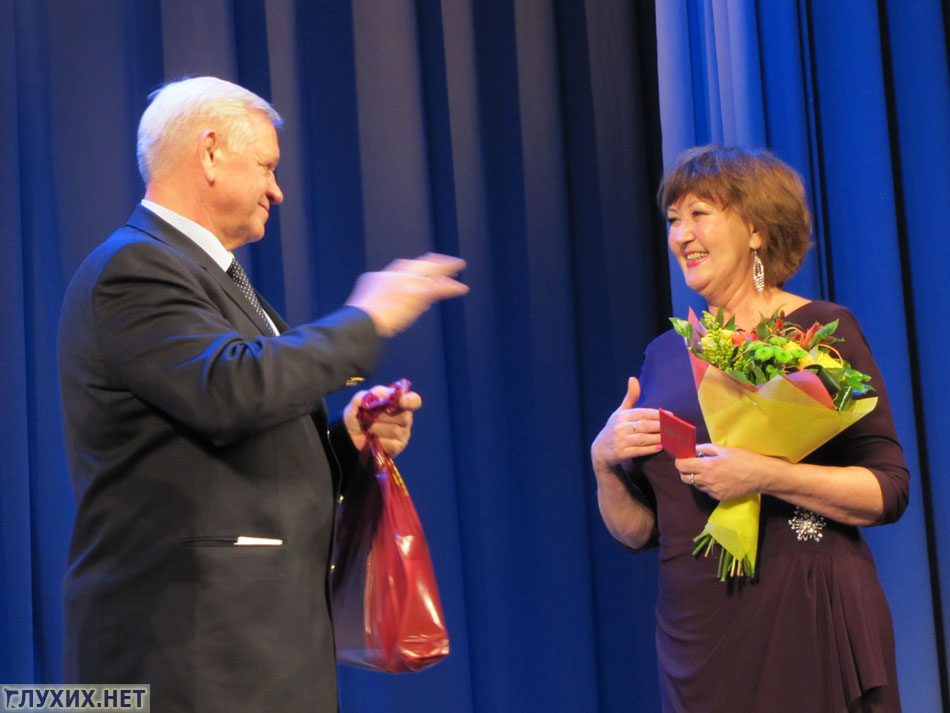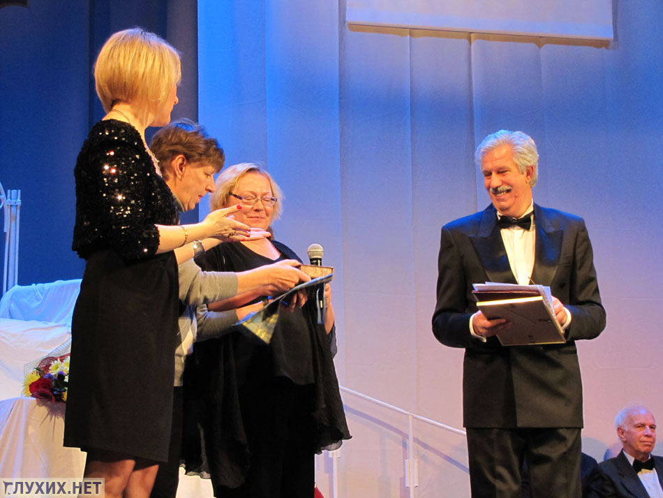 Президент Всероссийского общества глухих В. Н. Рухледев вручил членам ВОГ – актёрам театра Мимики и Жеста почётные звания Всероссийского общества глухих.