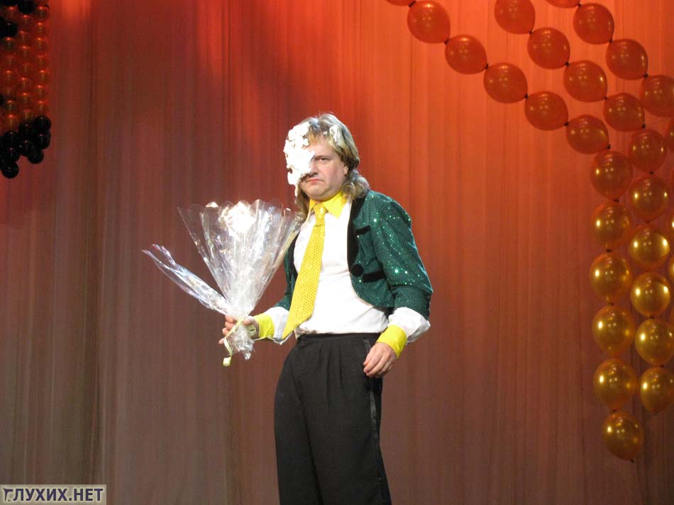 В конце этой сценки голубой пиджак споткнулся и нечаянно забросил торт за кулисы… Через минуту из-за занавески вышел мрачный Кирюха…