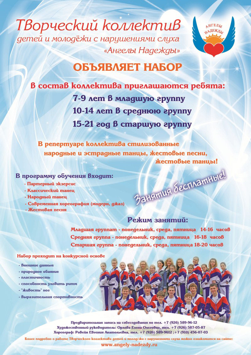 Творческий коллектив «Ангелы надежды» проводит набор всех желающих ребят! В репертуаре коллектива стилизованные, народные, современные танцы, жестовые танцы и жестовые песни.