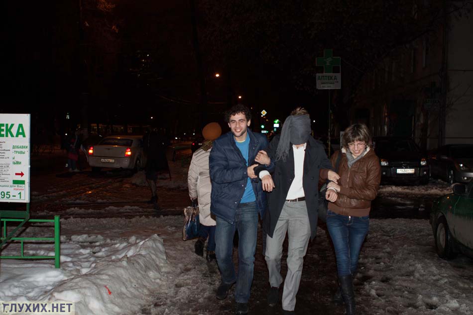Товарищи, предварительно завязав шарфом глаза Джеймсу, повели его по скользким тротуарам до служебного входа ТМЖ.