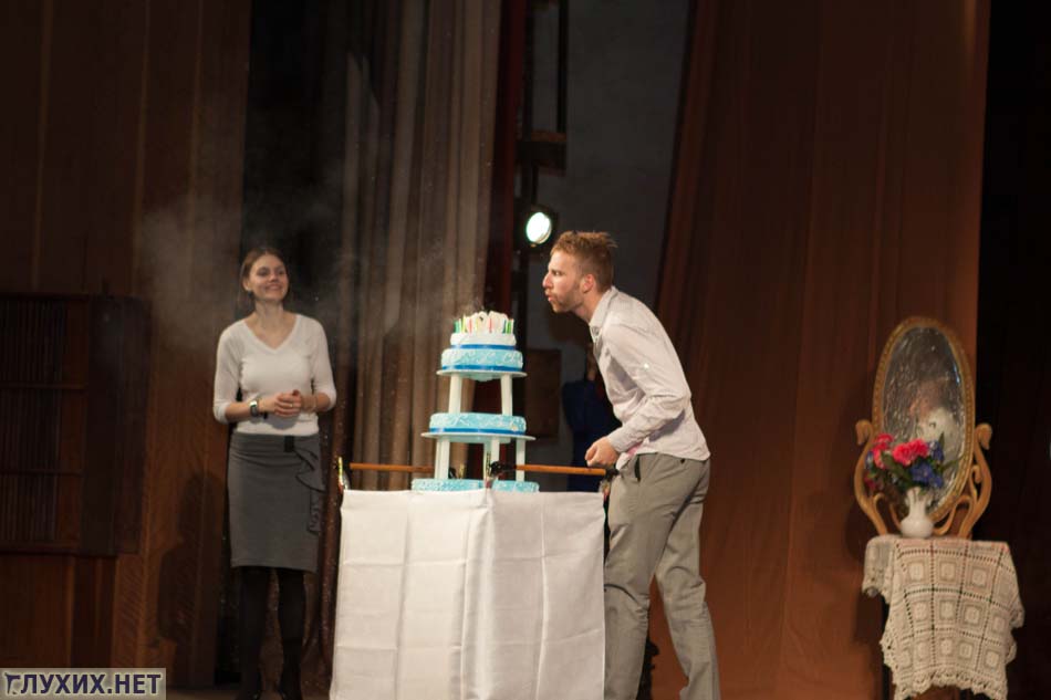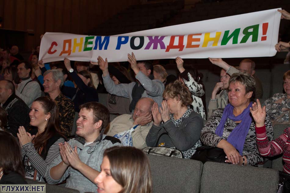 Когда имениннику развязали глаза, он обмер от увиденного: весь зал ему аплодировал, даже был развешен баннер «С днём рождения!». Затем началась небольшая праздничная программа в честь юбиляра.