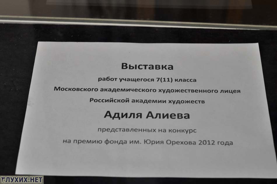 Молодой скульптор Адиль Алиев также является участником выставок «Надежда», «Счастливая семья – основа общества» в 2010 и 2011 гг., The World Deaf Artists Exchange Exhibition (Южная Корея, 2011), в том же году он выставлял свои работы в галерее в Химках. Лауреат конкурса «Будущий скульптор» – 2012 (МАХЛ РАХ). Скульптуры, которые были на этой выставке, ранее были представлены на конкурс на премию фонда им. Юрия Орехова 2012 года.