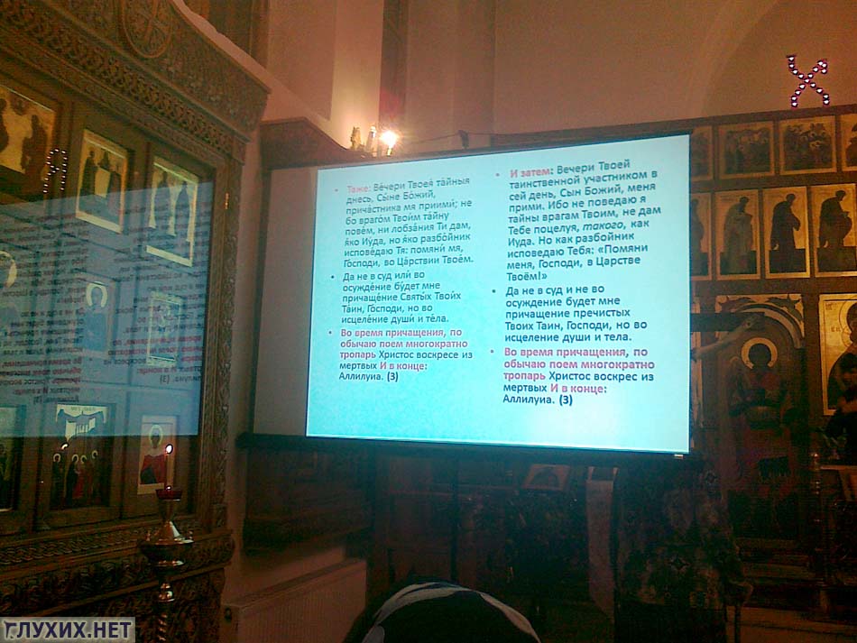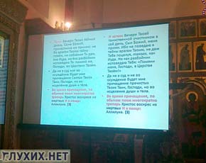 Настоятель храма святителя Тихона отец Анатолий все время ищет способы, возможности донести до неслышащих Слово Божие. В храме были и богослужения с сурдопереводом, и доска с проектором, на которой высвечиваются слова молитвы, которая сейчас поется священниками. Также, при небольшом стечении глухих прихожан на Богослужении, использовался и ноутбук, экран которого могли видеть все, сгрудившись у столика.