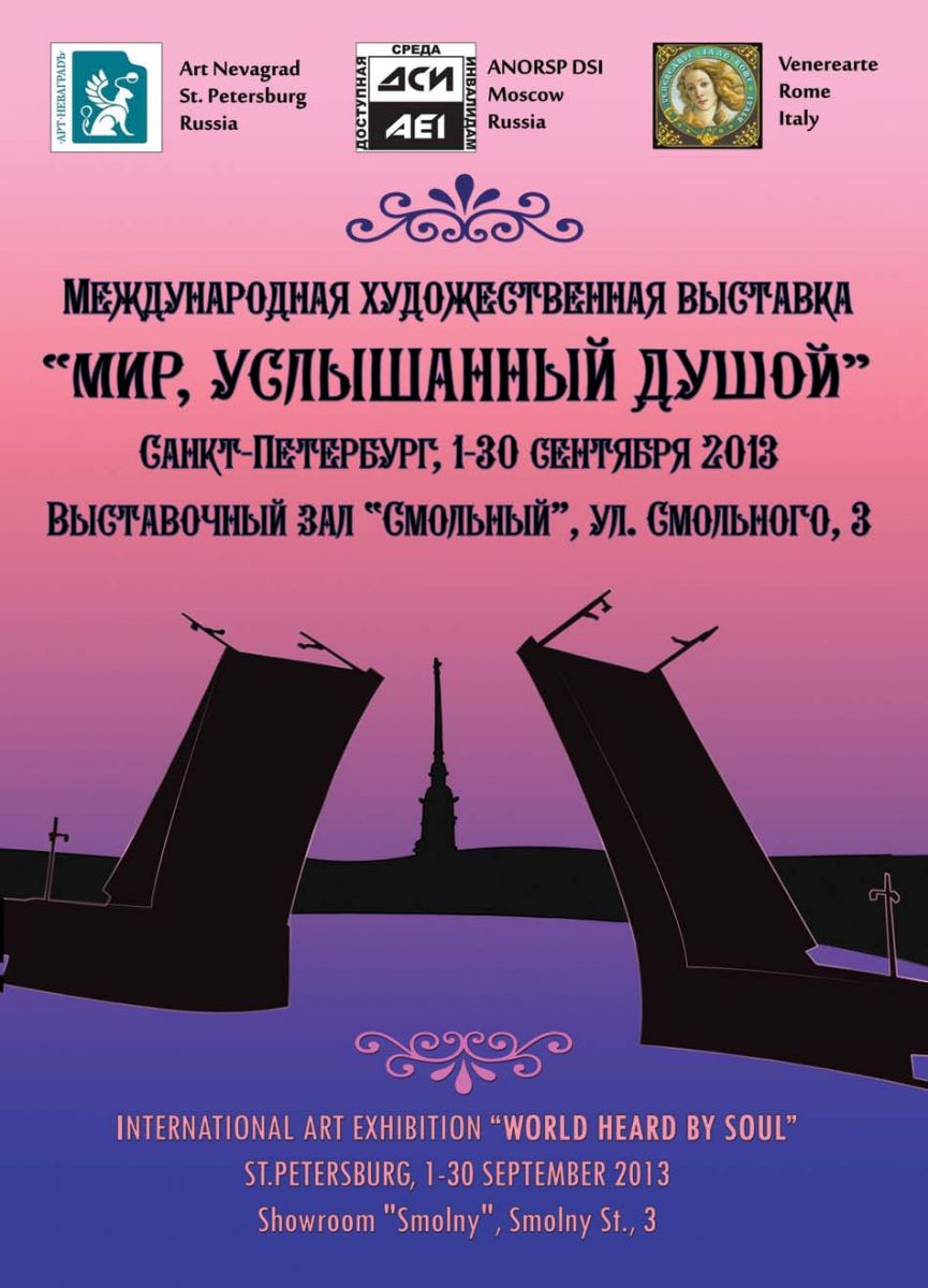 Некоммерческая организация «Доступная среда – инвалидам» (г. Москва) при поддержке Комитета по культуре Санкт-Петербурга, ГБУК ЛО «Музейное агентство», международной ассоциации глухих художников «ВЕНЕРЕАРТЕ» (Италия), общественного объединения неслышащих художников Санкт-Петербурга, Ленинградской области «АРТ-НЕВАГРАДЬ приглашает профессиональных художников с проблемами слуха (живопись, графика) принять участие в социально-культурном мероприятии «Международная Художественная Выставка «Мир, услышанный душой». Мероприятие проводится с 1 сентября по 30 сентября в выставочном зале «Смольный» в Санкт-Петербурге по адресу: ул. Смольного, 3.