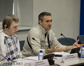 Отрадно, что на этом мероприятие активное участие принимал участие неслышащий социальный предприниматель Кирилл Васильев. Он известен в московских кругах людей с нарушениями слуха как организатор салона «Надин», где работают неслышащие специалисты. Салон, в первую очередь, ориентирован на предоставление услуг глухим и слабослышащим людям. Надо сказать, что Кирилл не сразу пришел в социальный бизнес. Он выпускник легендарной московской «тридцатки», затем закончил вуз, став инженером в области пищевой промышленности. Работал на госпредприятии, затем в коммерческой структуре. Имеет несколько патентов на различные изобретения, был востребованным специалистом. Но он решил уйти в бизнес, и в непростой бизнес — социальный. Вместе со своей супругой Надеждой Шараповой они открыли в Москве салон «Надин». И на этом Кирилл с Надей останавливаться не хотят. В планах расширение бизнеса... Но это пока в планах. А, сейчас, Кирилл столкнулся с различными трудностями, о которых он и рассказал на Круглом столе. Также, он изложил свое видение социального предпринимательства. Была очень оживленная дискуссия. И, по результатам этого разговора, в протокол было внесено решение о необходимости налоговых преференций.