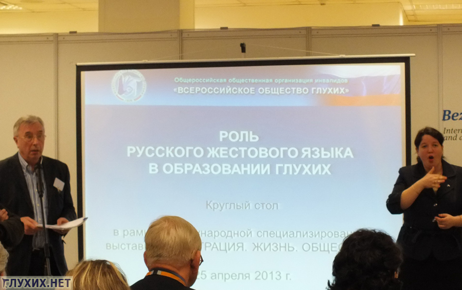 В 14 часов начал свою работу Круглый стол «Роль русского жестового языка в образовании глухих», где засветились почти все воговские деятели. Тут были: Президент ВОГ Рухледев В. Н., начальник отдела соцпрограмм и проектов Управления социальной политики и реабилитации Аппарата ОООИ ВОГ Максим Ларионов, директор Центра образования глухих и жестового языка Анна Комарова, её заместитель Т. П. Давиденко, директор ГУИМЦ профессиональной реабилитации инвалидов МГТУ им. Баумана А. Г. Станевский, заведующая лабораторией жестового языка РГСУ В. П. Камнева, старший преподаватель Белорусского государственного университета Л. С. Димскис., преподаватели школы-интерната № 65 Н. А. Чаушьян, Е. А. Сильянова и другие.
